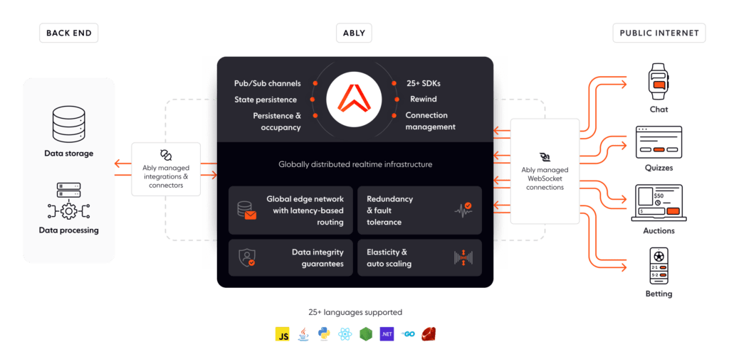 Ably sử dụng các giao thức realtime như WebSockets, Server-Sent Events (SSE) và MQTT để đảm bảo dữ liệu được truyền đi gần như ngay lập tức.