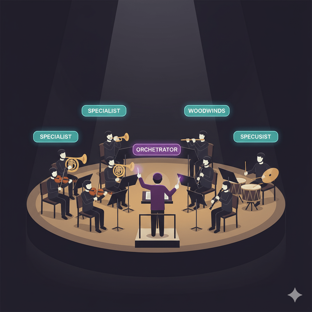 Hãy tưởng tượng một dàn nhạc giao hưởng. Nếu bạn bắt một người nhạc công vừa chơi violin, vừa thổi kèn trumpet, vừa đánh trống, kết quả sẽ là một mớ hỗn độn. Thay vào đó, chúng ta có những chuyên gia (specialists) tập trung vào nhạc cụ của họ, và một nhạc trưởng (conductor) giữ nhịp điệu chung.