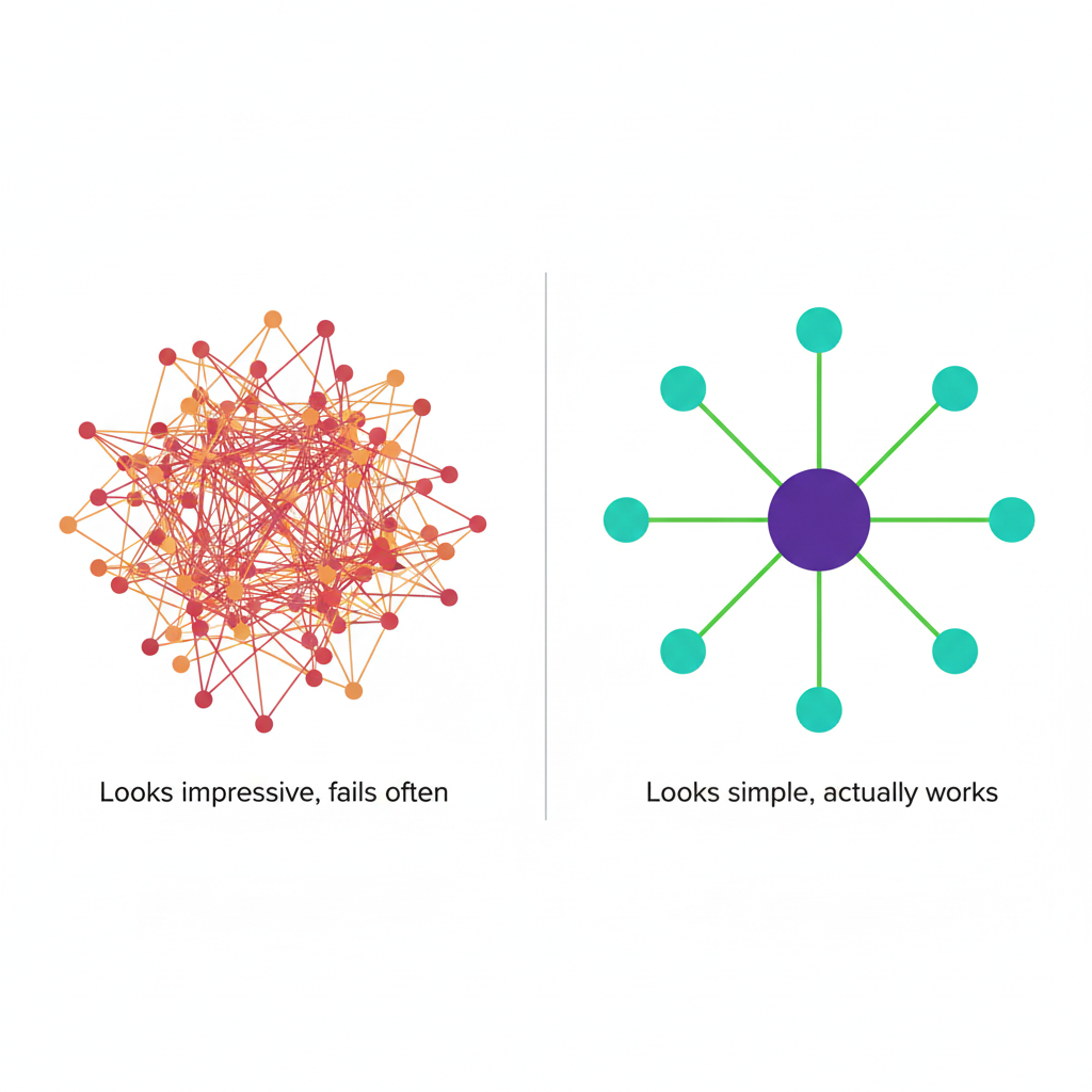 Sự phức tạp nên nằm ở Prompts (hướng dẫn chi tiết cho từng vai trò) chứ không phải ở Kiến trúc (cách chúng nối dây với nhau). Một hệ thống orchestration rối rắm thường dẫn đến việc các Agent “cãi nhau” hoặc đi vào vòng lặp vô tận mà bạn không thể debug nổi.