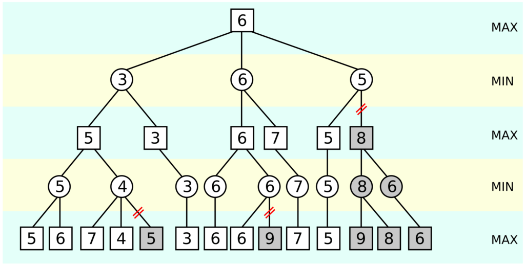 Hình minh họa về thuật toán cắt tỉa alpha-beta. Các nhánh con được tô xám không cần phải được khám phá (khi các nước đi được đánh giá từ trái sang phải), vì người ta biết rằng toàn bộ nhóm các nhánh con cho ra giá trị tương đương hoặc tệ hơn một nhánh con khác, và do đó không thể ảnh hưởng đến kết quả cuối cùng. Mức tối đa và tối thiểu lần lượt đại diện cho lượt chơi của người chơi và đối thủ